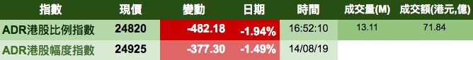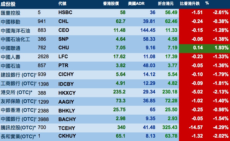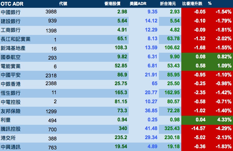 智通财经APP获悉,周三美股再次暴跌,拖累港股ADR指数受压,按比例计算,收报24820点,跌482.18点。大型蓝筹股全线疲弱,汇丰控股收报56.49元,较港收市跌1.51元;腾讯控股收报325.43元,较港收市跌14.57元。