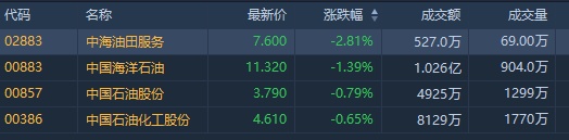 智通财经APP获悉,美国能源信息署(EIA)周三公布的数据显示,上周美国原油库存连续第二周意外上升,NYMEX原油期货收跌3.77%。港股石油板块集体走弱,截至发稿,中海油田服务(02883)跌2.81%,中海油(00883)跌1.39%,中石油(00857)跌0.52%,中石化(00386)跌0.86%。