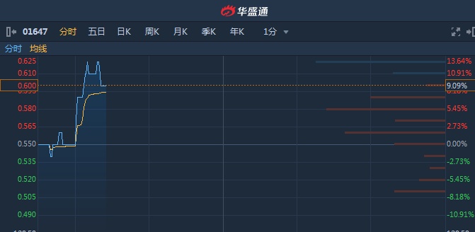 智通财经APP获悉,雄岸科技(01647)盘中股价直线拉涨,涨幅一度超12.5%,截至10时24分,涨9.09%,报价0.6港元,成交额394.6万。