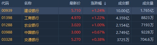 智通财经APP获悉,今日人民银行扩量续作4000亿元1年MLF,内银股低开高走。截至发稿,建设银行(00939)涨1.24%,报5.71港元,成交额9.93亿港元;工商银行(01398)涨1.22%,报4.97港元,成交额4.36亿港元;农业银行(01288)涨1%,报3.02港元,成交额2.15亿港元。