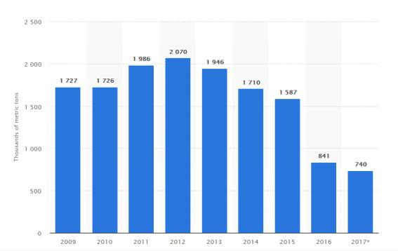 2014年-2016年,由于成本太高,美国铝企开始出现倒闭风潮。2017年,美国铝产业仅剩下2家公司、5个工厂,其中3个工厂还无法正常运转。有数据显示,2016年和2017年,美国原铝产量分别降到84.1万吨、74万吨,甚至不及冰岛、巴林、挪威等中东和北欧小国。