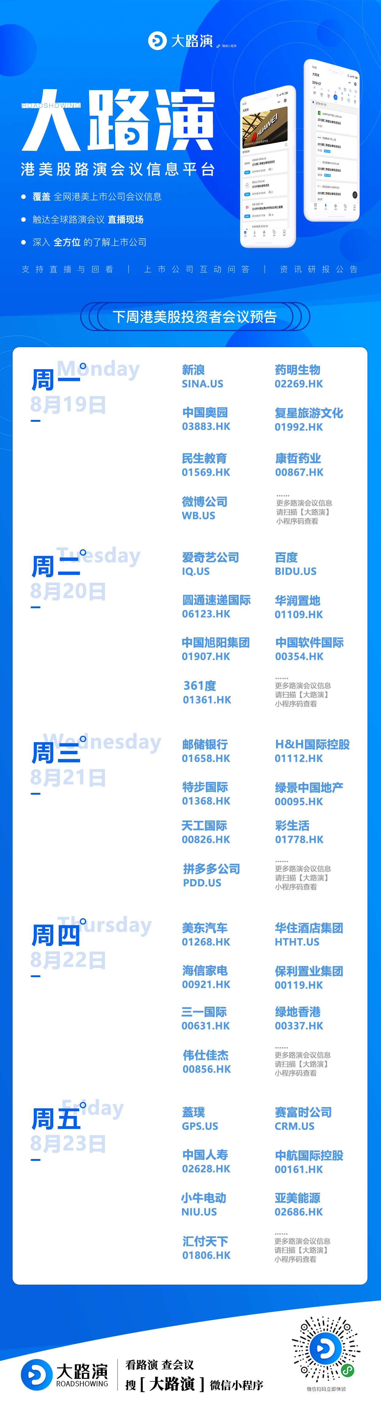 以下是智通财经“大路演”为您整理的下周(8月19日-8月23日)港美股上市公司会议日历。