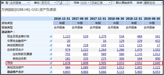 万洲国际2019上半年库存大幅增加了6亿美元(或28.7%)至26.4亿美元,而收入同比微降至111.6亿美元,库存增幅大幅领先于收入增幅。