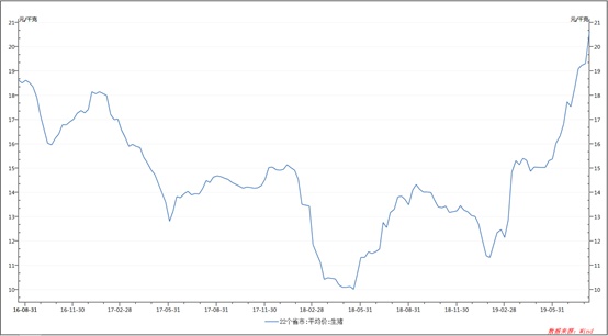 中国2019年上半年生猪价格持续上涨,平均生猪价格为每公斤人民币14.3元,同比上升16.1%;美国2019年上半年平均生猪价格为每公斤1.15美元,同比上升0.9%。美国生猪肉价格表现平稳,而当前国内生猪肉价格以及大于每公斤人民币20元,价差约为2.5倍。