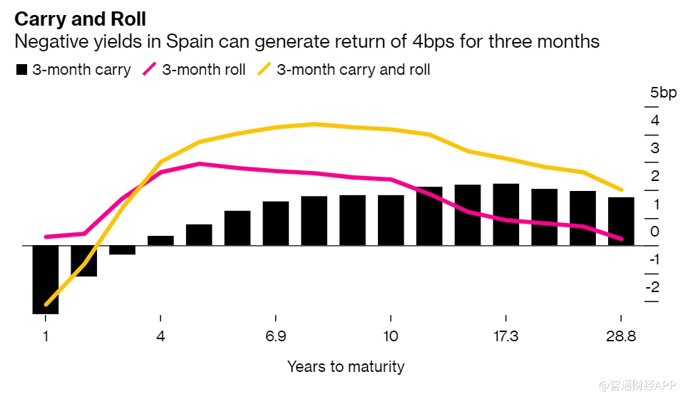 上图显示了交易者使用这个策略在西班牙债券市场获得正回报,西班牙3个月期的回购利率为负0.4%,交易者在使用该利率借钱后投入了西班牙7至8年期的国债,赚取了约4个基点的利差。