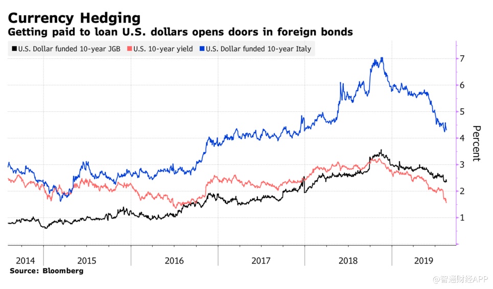 从负收益债券中获取回报的另一种方法是通过货币对冲,拥有美元的投资者可以从欧洲和日本的负收益率中获得正回报。使用3个月期的远期货币协议兑换日元的年化收益率接近2.6%,然后,投资者可以将资金投入避险资产,如收益率为负0.235%的日本10年期债券。