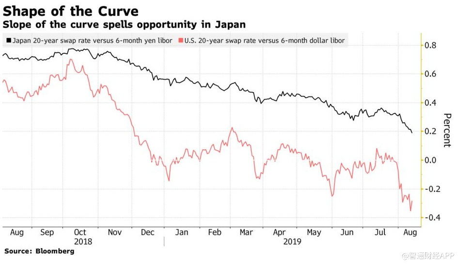 较陡峭的曲线提供了更多套利机会,投资者可以在短期内借钱后投入长期债券。在日本,6月期LIBRO(即银行间的借贷成本)为负0.05%,而20年日元掉期利率为正0.11%,利差为0.16%。