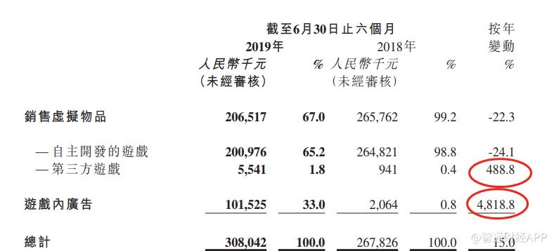 智通财经APP发现,禅游科技业绩的增长主要得益于游戏内广告业务以及第三方游戏收入的提升。2019年上半年时,该公司游戏内广告业务的收入为1.02亿元人民币,同比增长48倍。与此同时,来自第三方游戏的收入为554万元,同比增长4.8倍。
