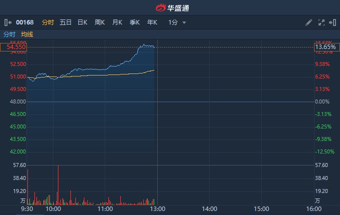 智通财经APP获悉,青岛啤酒(00168)昨日发布财报,中期业绩亮眼。早盘高开高走,截至发稿。涨13.85%,报54.75港元,成交额3.17亿港元。
