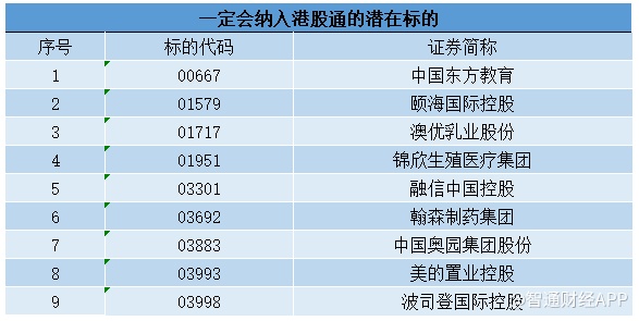 一、已纳入恒生综合大中型指数的成分股,一定会纳入港股通标的的9家公司