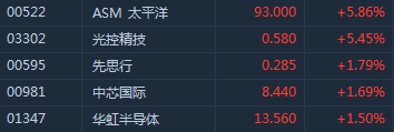 智通财经APP获悉,午后芯片股随A股整体走强,ASM太平洋(00522)领涨板块,截至14时25分,ASM太平洋(00522)涨5.96%,报价93港元,中芯国际(00981)涨1.69%,华虹半导体(01347)涨1.5%。