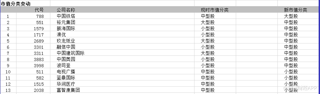 另外市值分类方面也有所变动,如中国铁塔(00788)被调整为大型股。
