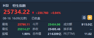 智通财经APP获悉,恒生指数开盘跌10.5点或0.04%,报25484.96点,全天震荡上行。截至收盘,恒生指数涨238.76点或0.94%,报25734.22点,全日成交额达915.02亿。国企指数涨0.61%,报9964.3点,红筹指数涨1.32%,报4077.64点。
