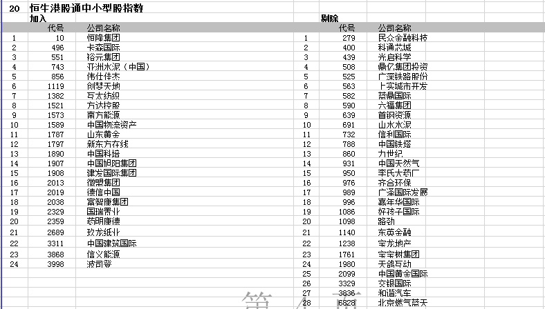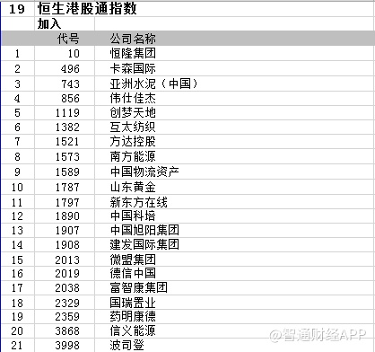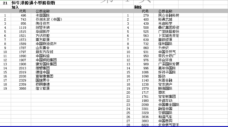 恒隆集团(00010)、创梦天地(01119)、山东黄金(01787)、中国旭阳集团(01907)等21只股票加入恒生港股通指数。同时,六福集团(00590)、交银国际(03329)等27只股票遭剔除。