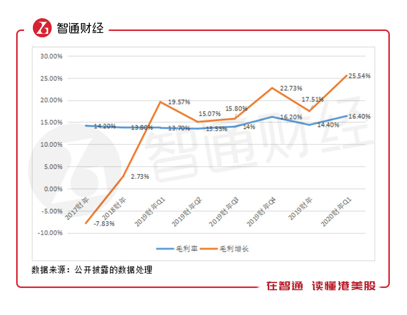 2020财年首季,该公司的毛利率为16.4%,创下历史以来新高,以季度看,2019财年Q1到2020财年Q1,毛利维持双位数的增速,且比收入增速要快得多,毛利率不断提升。