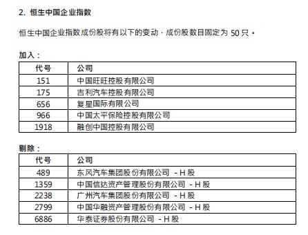 吉利汽车(00175)等将被纳入恒生中国企业指数成份股,东风汽车(00489)等将被剔除。成份股数目固定为50只。
