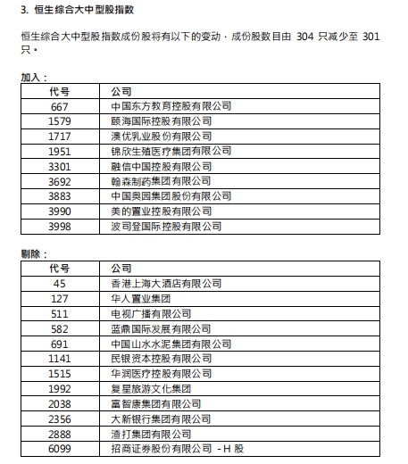 澳优乳业(01717)、中国奥园(03883)等将被纳入恒生综合大中型股指数成份股,渣打集团(02888)、富智康集团(02038)等将被剔除。成份股数目由304只减少至301只。
