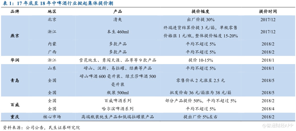 随着产量的日渐触顶以及成本处于高位,啤酒行业的产品升级趋势也日益明显。近日,民生证券研报中的一组数据也显示,一场啤酒行业的提价潮正由去年掀起。