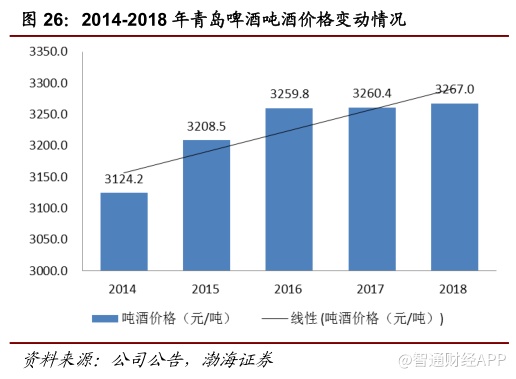 智通财经APP了解到,随着近年来啤酒产品因成本上涨被动调价、及高端产品比例的逐步提升,行业吨酒价格整体出现上涨趋势。据渤海证券研报显示,2014-2018年间,青岛啤酒吨酒价格由3124.2 元/吨上涨4.57%至3267.0 元/吨。
