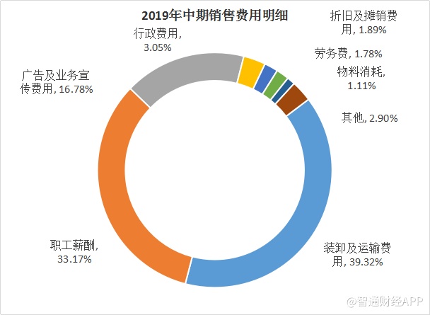 其中,公司销售费用两项占比最大的费用中,装卸及运输费用较去年同期上涨3.56个百分点至39.32%,为目前占销售费用比重最大的费用;相比之下,职工薪酬较去年同期下降1.92个百分点至33.17%。