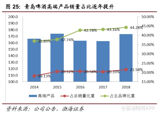 智通财经APP了解到,上半年,公司青岛品牌及其他品牌产品销量分别达236 万千升、237 万千升,同比分别增长6.3%、1%。相比之下,纯生、1903 等高端产品销量增速则达到10%。据渤海证券研报中数据显示,2014年以来,公司高端产品销量的占比也呈逐年提升趋势。