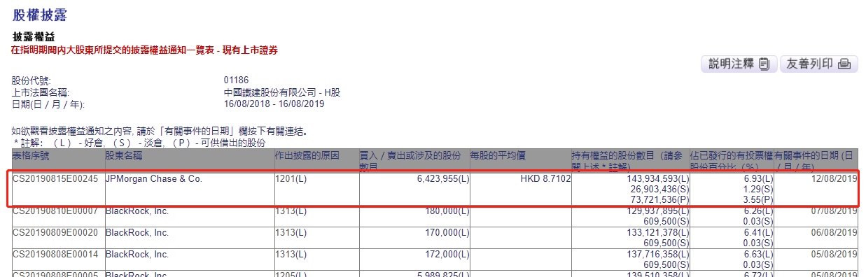 智通财经APP获悉,联交所最新资料显示,8月12日,摩根大通减持中铁建(01186)642万股,每股作价8.7102港元,涉及总金额约为5592万港元。减持后最新持股数目约为1.44亿股,最新持股比例为6.93%。