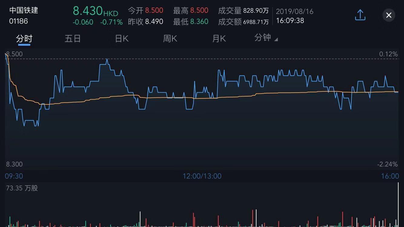 截至今日收盘,中铁建(01186)跌0.71%,报8.430港元。