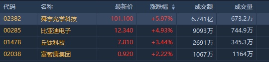 智通财经APP获悉,8月16日,华为首款5G手机华为Mate20X5G正式开售。开售前预约量超过100万台,超市场预期,手机产业链板块全线走强。截至发稿,舜宇光学(02382)涨5.97%,报101.1港元;比亚迪电子(00285)涨4.59%,报12.3港元;丘钛科技(01478)涨3.58%,报7.82港元;富智康集团(02038)涨3.33%,报0.93港元。