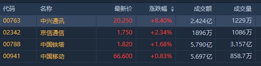 截至发稿,中兴通讯(00763)涨8.4%,报20.25港元,成交额2.42亿港元;京信通信(02342)涨2.34%,报1.75港元,成交额1896万港元;中国铁塔(00788)涨1.68%,报1.82港元,成交额5.79亿港元;中国移动(00941)涨0.83%,报66.6港元,成交额5.69亿港元。