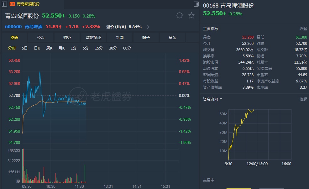 智通财经APP获悉,野村发表报告指出,青岛啤酒(00168)上半年业绩胜预期,重予其“买入”投资评级及目标价62.3港元,此按现金流折现率作估值。