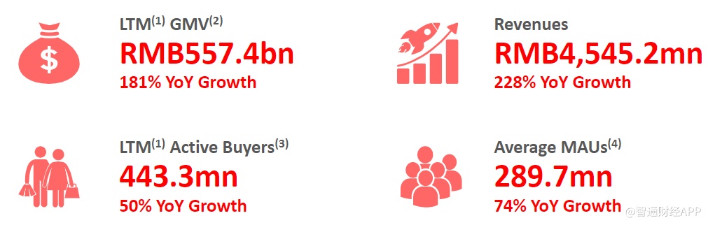 此外,每位活跃买家的年度支出增长87%至1257.3人民币(约合187.3美元),年销售总额(GMV)增长181%至5574亿人民币(约合831亿美元)。