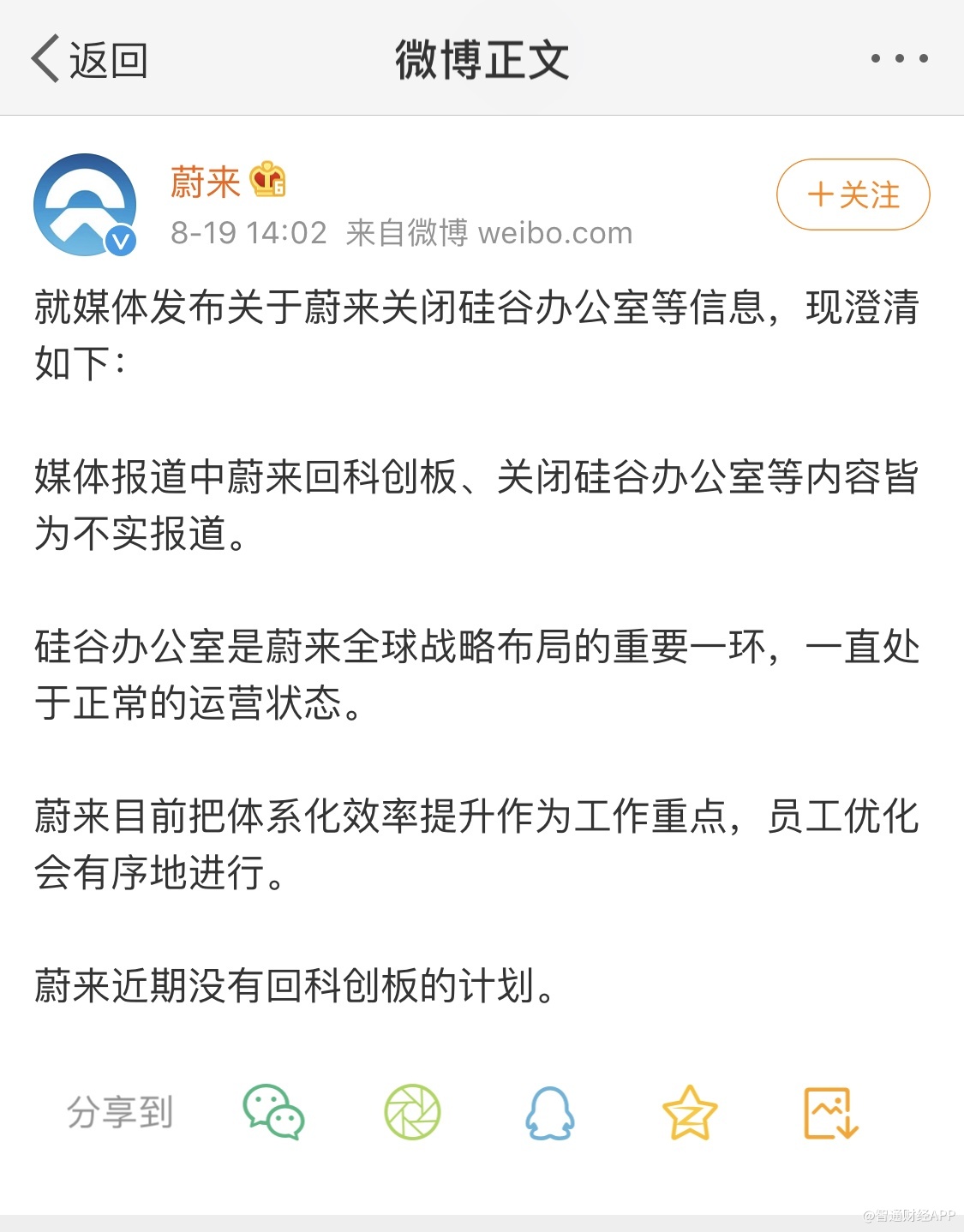 智通财经APP获悉,蔚来汽车(NIO.US)就回科创板上市、关闭硅谷办公室等传闻在官方微博上作出澄清。