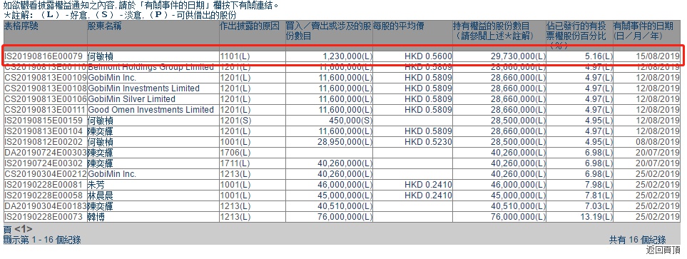 智通财经APP获悉,联交所最新资料显示,8月15日港银控股(08162)获股东何敏桢增持123万股,每股作价0.56港元,总值约为68.88万港元,最新持股数目约为2973万股,最新持股比例为5.16%。
