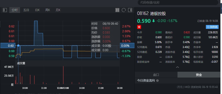截至今日收盘,港银控股跌1.67%,报0.59港元。