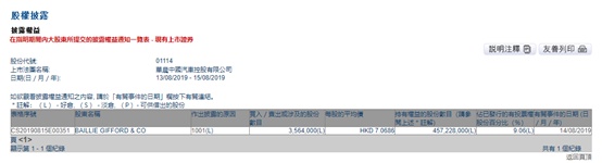 智通财经APP获悉,联交所最新资料显示,8月14日华晨中国(01114)获BAILLIE GIFFORD&CO增持356.4万股,每股作价7.0686港元,总值约为2519.25万港元,最新持股数目约为4.57亿股,最新持股比例为9.06%。