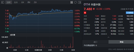 截至今日收盘,华晨中国(01114)涨3.89%,报7.48港币。