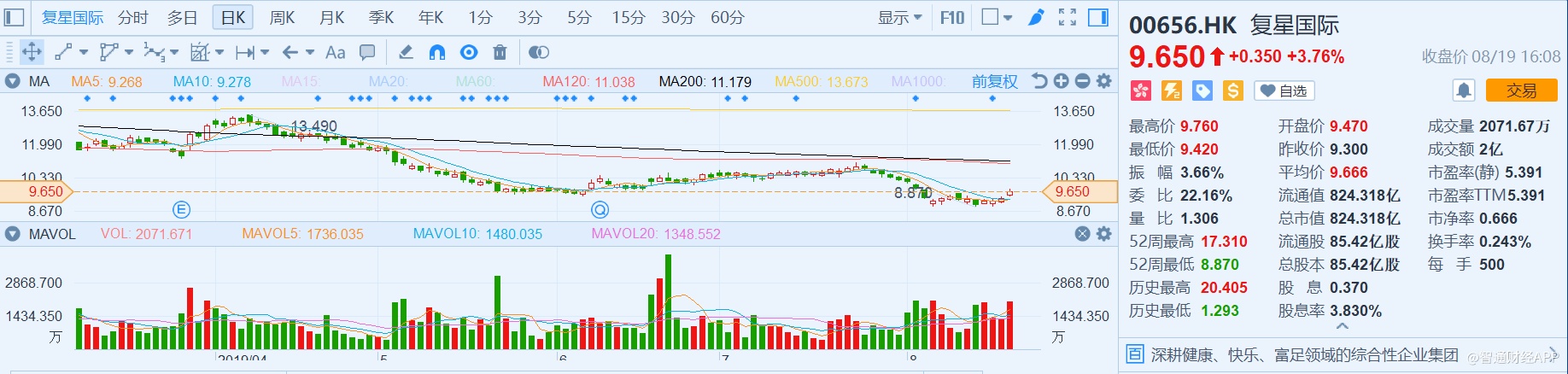根据恒生指数公司最新公布的季检结果,复星国际(00656)将于9 月9日纳入恒生中国企业指数,这意味着该公司将会受到更多资金的关注。受该消息影响,复星国际8月19日收涨3.76%报9.65港元,成交量2071.67万,成交额2亿港元。