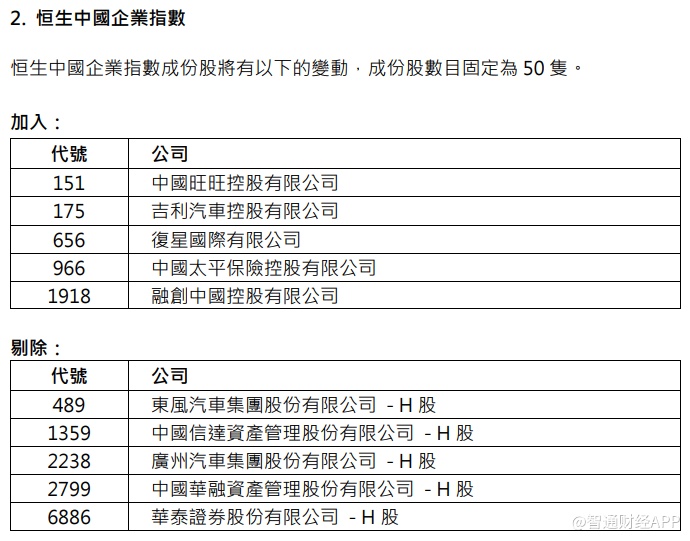 除了新增复星国际,本次恒生中国企业指数的季检调整还加入了中国旺旺(00151)、吉利汽车(00175)、中国太平(00966)及融创中国(01918),而东风集团股份(00489)、中国信达(01359)、广汽集团(02238)、中国华融(02799)及华泰证券(06886)则被剔除。