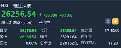 智通财经APP获悉,恒生指数开盘跌35.3点或0.13%,报26256.54点。国企指数跌0.29%,报10080.02点。红筹指数跌0.63%,报4132.71点。大市盘前成交17.62港元。