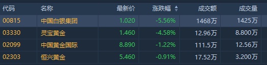 截至发稿,中国白银集团(00815)跌6.48%,报1.01港元;灵宝黄金(03330)跌4.58%,报1.46港元;中国黄金国际(02099)跌1.22%,报8.89港元;恒兴黄金(02303)跌0.91%,报5.46港元。