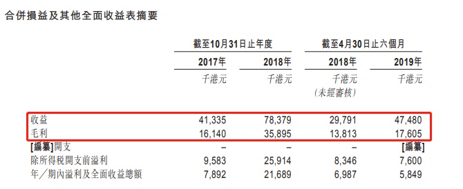 截至2017年、2018年10月31日止两个年度,该公司营收由约4133.5万港元增至约7837.9万港元,同比增长约89%,主因荔枝角零售店于2017年12月开始营业、2018年6月观塘店因搬迁至面积更大的场所而扩大、营销力度加大、客户购买力增强等而大幅增加。毛利由1614万港元增长至3589.5万港元。截至2018年、2019年4月30日止四个月该公司毛利由约1381.3万港元增至截至约1760.5万港元。