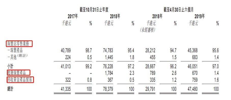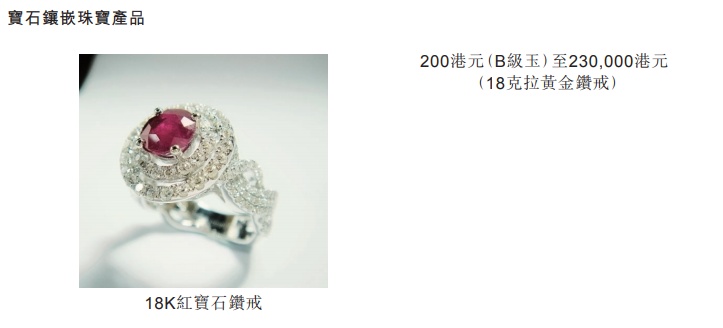 旗下产品包括中端宝石镶嵌珠宝产品、黄金珠宝产品、裸钻及宝石、黄金首饰及白银珠宝产品。为扩大其客源,自截至2018年10月31日止年度起,该集团增营珠宝产品批发业务及黄金产品的回收黄金产品贸易业务。