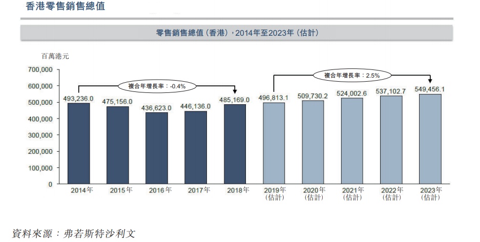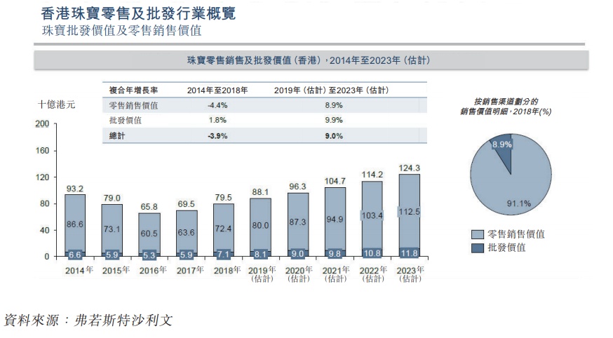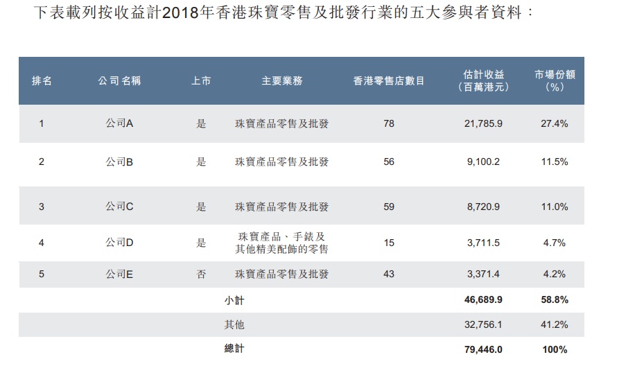 市场及竞争:根据弗若斯特沙利文报告称,截至2018年,香港约有300家珠宝零售商及批发商。香港珠宝市场由若干大型珠宝零售商高度垄断且有大量中小型珠宝零售商。于2018年,五大市场参与者的估计收益合共为467亿港元,占香港珠宝零售及批发市场总收益的58.8%。