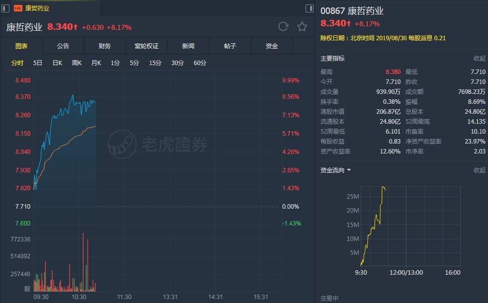 智通财经APP获悉,瑞信发表研究报告称,康哲药业(00867)上半年业绩略胜该行预期,收入同比增长11.7%至29.64亿元人民币,净利润同比增长22.2%至11.7亿元人民币,主因毛利率及净利润率较预期理想。该行上调集团2019年及2020年盈利预测2.4%及1.3%,至21.82亿元人民币及24.67亿元人民币,并将其目标价相应由9.1港元升至9.58港元,估值吸引,下行风险有限,维持“跑赢大市”评级。