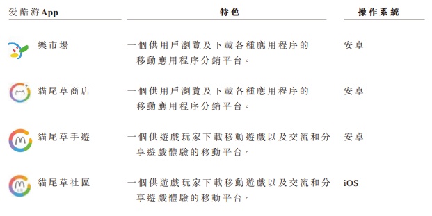 爱酷游是一家移动互联网运营平台,主要业务是通过公司自主开发的移动应用程序“爱酷游APP”为多款移动应用程序提供用户获取服务。爱酷游APP包括乐市场、猫尾草商店、猫尾草手游、猫尾草社区以及三国日报。