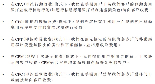 在定价方面,公司则采取多种定价模式将优质的用户流量转换为收入,其中主要包括CPA、CPS、CPT、CPM和CPC。
