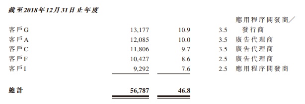 公司的客户主要包括应用程序开发商、发行商、媒体发行商、广告代理商及其它移动互联网公司。截至2018年12月31日,公司的五大客户产生的收入为5680万元,占总收入比重的46.8%,同比下降了7.2个百分点。
