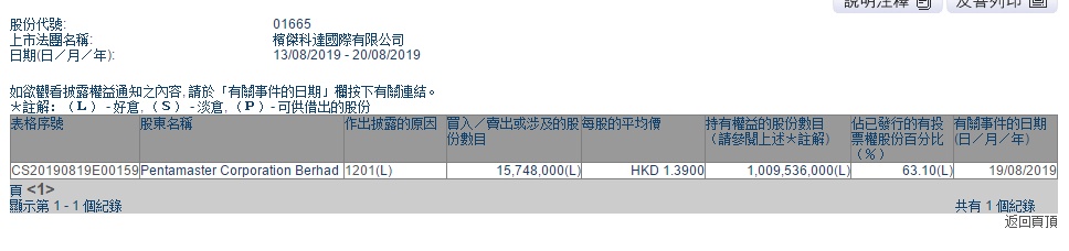 智通财经APP获悉,联交所最新资料显示,8月19日,槟杰科达(01665)被控股股东PentamasterCorporation减持1574.8万股,每股平均价1.39港元,涉及总金额约为2189万港元。减持后PentamasterCorporation最新持股数目约为10.1亿股,最新持股比例为63.1%。