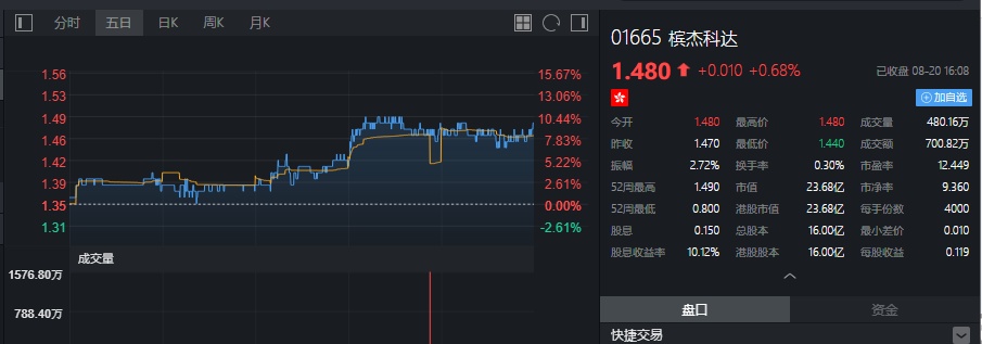 截止今日收盘,槟杰科达涨0.68%,报1.48港币。