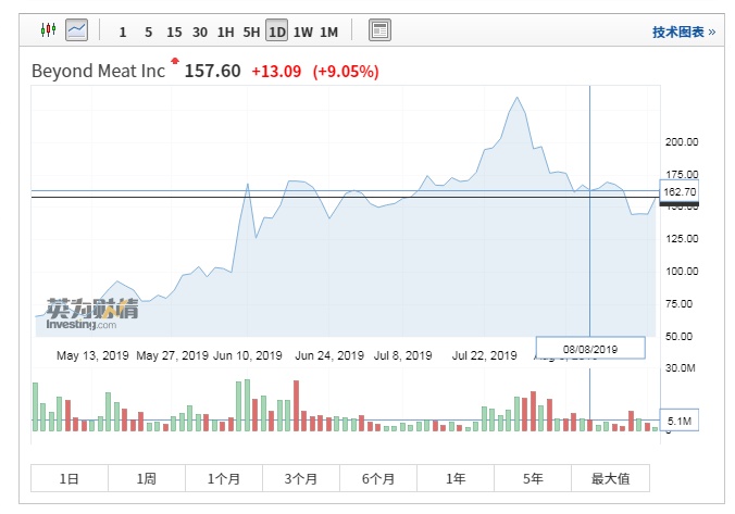 智通财经APP获悉,8月20日美股开盘,人造肉公司Beyond Meat(BYND.US)一路上涨。截止北京时间21.37,Beyond Meat涨9.05%,报157.60美元。